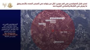 وأضاف “نتوجه إلى سكان المبنى المحدد بالأحمر في الخريطة المرفقة والمباني المجاورة له: أنتم تتواجدون بالقرب من مبنى يستخدمه حزب الله، فمن أجل سلامتكم أنتم مضطرون لإخلاء المباني فورًا والابتعاد عنها لمسافة لا تقل عن 500 متر. البقاء في منطقة المبنى المحدد يعرضكم للخطر”.