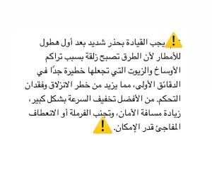 طلبت غرفة التحكم الموري من السائقين توخي الحذر وتخفيف السرعة بسبب تساقط الأمطار تفادياً للانزلاقات وللصدامات المرورية