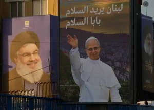 لافتتان متقابلتان على طريق بيروت تتضمن الأولى ترحيباً بالبابا ليو الرابع عشر تحت شعار “لبنان يريد السلام” والثانية لأمين عام “حزب الله” الأسبق حسن نصر الله.