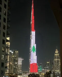 أضاءت الامارات برج خليفة بصورة العلم اللبناني في ذكرى استقلاله الثاني والثمانين.