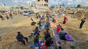 وأقام فلسطينيون صلاة الجمعة على أنقاض المنازل في حي الفراحين شرقي خان يونس على السياج الحدودي، الذي تدمر بالكامل خلال العدوان على غزة.