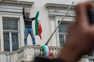 اندلعت مظاهرات احتجاجًا على قطع الإنترنت في إيران، بينها تحرك في لندن شهد قيام أحد المحتجين بإنزال العلم الإيراني من أمام سفارة البلاد ورفع علم ما قبل الثورة الذي يتوسطه رمز “الأسد والشمس”.
