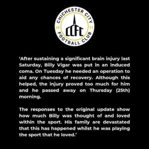 أضاف: “ببالغ الحزن يؤكد نادي تشيشستر سيتي لكرة القدم وفاة بيلي فيغار. نرجو احترام خصوصية عائلته في هذا الوقت العصيب”.