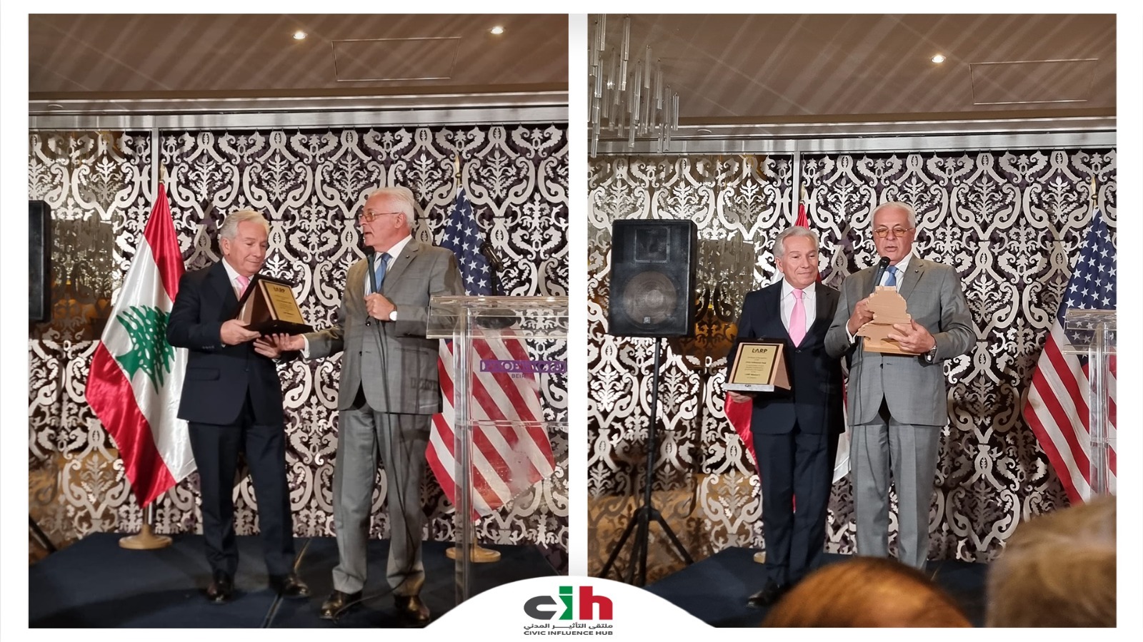 من فعاليّات حفل التكريم الذي أقامته مؤسّسة شراكة النهضة اللّبنانيّة – الأميركيّة (LARP) عضو لجنة التنسيق اللّبنانيَّة-الأميركيَّة (LACC) الذي أقيم في فندق فينيسيا 27-09-2025، كرّمت LARP في شهادة تقدير ملتقى التأثير المدني (CIH) تثميناً للجهود التي بذلها في تعزيز روح التّنسيق بين الاغتراب اللّبناني والمقيمين من أجل إرساء دولة المواطنة، والدّستور، والسّيادة.