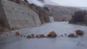 كذلك، أدى تساقط الامطار الغزيرة الى انهيار الصخور على طريق حزرتا – ترشيش بعد حاجز الدرك.