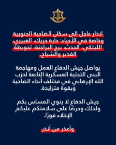 نشر ادرعي عبر اكس: “انذار عاجل إلى سكان الضاحية الجنوبية وخاصة في الأحياء: 🔸حارة حريك 🔸الغبيري 🔸الليلكي 🔸الحدث 🔸برج البراجنة 🔸تحويطة الغدير 🔸الشياح ⭕️يواصل جيش