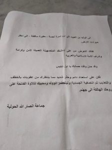 “هيك تصبّح الإعلامي #وليد_عبّود اليوم تحت بيتو . منشورات موقّعة باسم جماعة إرهابية عم تهددو بالخطف والقتل. في ناس بدا تاخد البلد ع مطرح كلنا عم نتجنّب نروح عليه لانو السلم الأهلي خط أحمر. منطالب