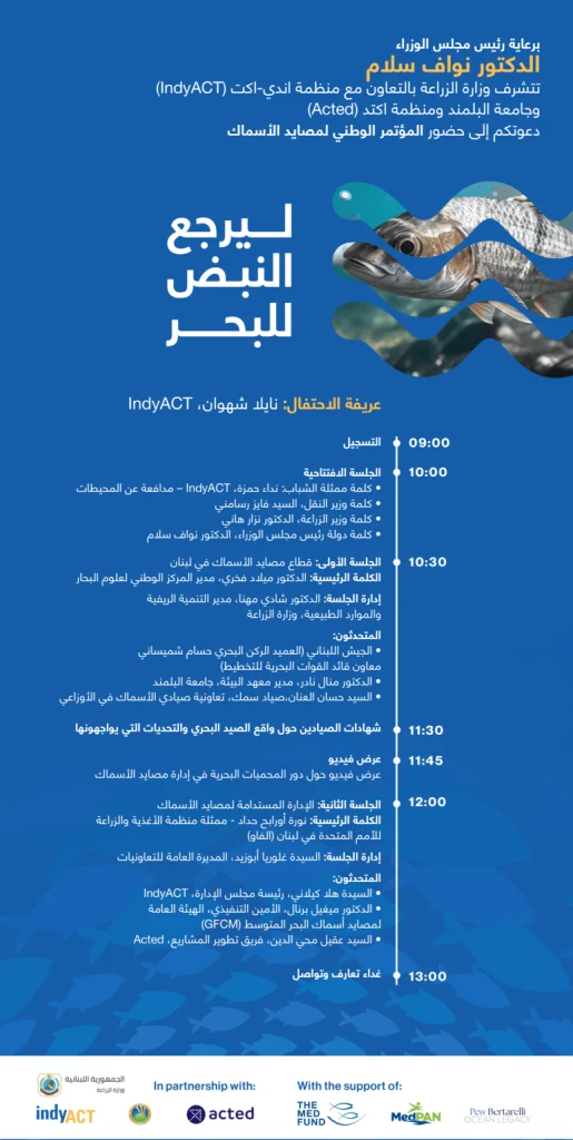 رعاية رئيس مجلس الوزراء الدكتور نواف سلام، نظّمت وزارة الزراعة، بالتعاون مع منظمة IndyACT، جامعة البلمند، ومنظمة ACTED، المؤتمر الوطني لمصايد الأسماك، وذلك في السراي الكبير في بيروت، بمشاركة واسعة