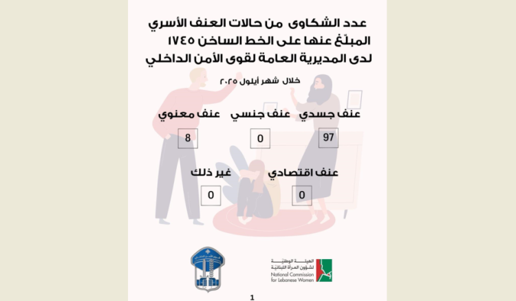 أفادت الهيئة الوطنية لشؤون المرأة اللبنانية، في بيان “عدد الشكاوى من حالات العنف الأسري المبلغ عنها على الخط الساخن 1745 لدى المديرية العامة لقوى الأمن الداخلي لشهر أيلول 2025، جاء