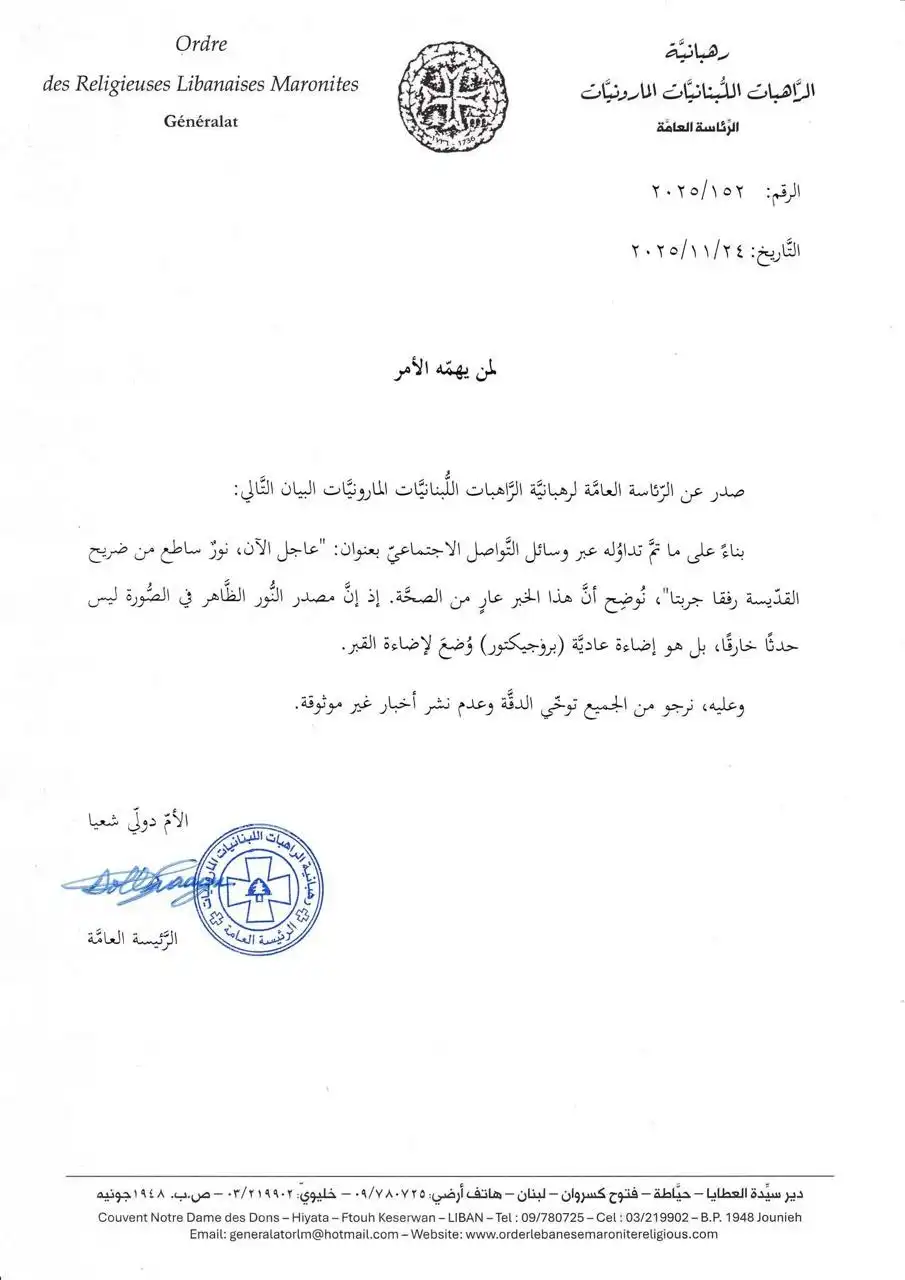 عد تداول أنباء عن ظهور نور من قبر القدّيسة رفقا في جربتا، أوضح دير مار يوسف حيث يقع الضريح أن ما يتم تداوله غير دقيق. وأكد الدير أن النور ناجم
