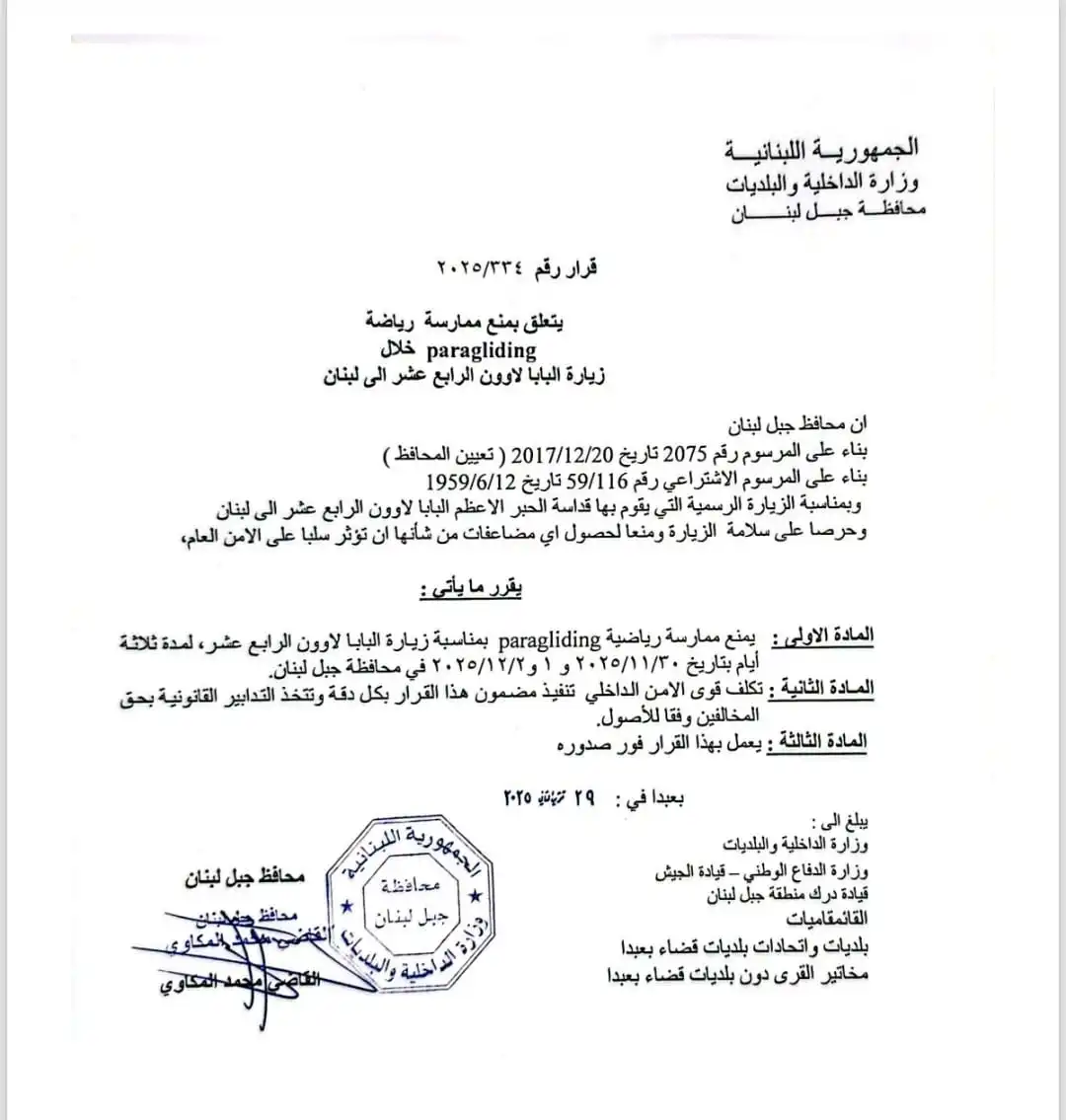 أصدر محافظ جبل لبنان القاضي محمد المكاوي قراراً يتعلّق بمنع ممارسة رياضة الـ paragliding خلال زيارة البابا لاوون الرابع عشر إلى لبنان. بالصورة- قرارٌ بمنع الـ paragliding خلال زيارة البابا