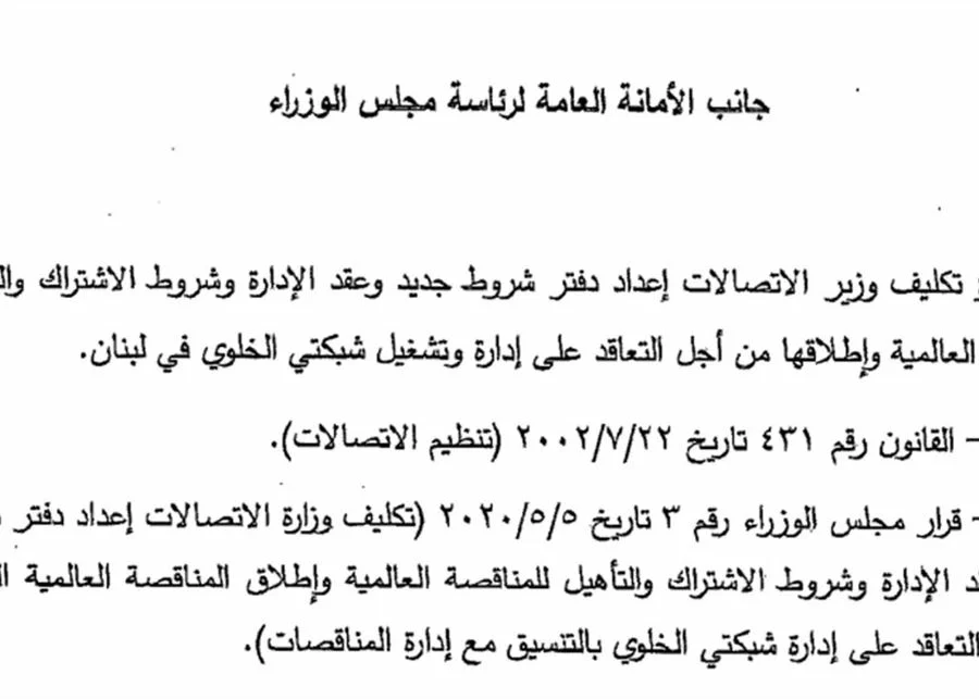 يعود ملف إدارة قطاع الخليوي وتشغيله إلى واجهة النقاش الحكومي، مع إدراج بند جديد في جدول أعمال مجلس الوزراء اليوم يقضي بإعداد دفتر شروط وعقد إدارة تمهيدا لإطلاق مناقصة عالمية.