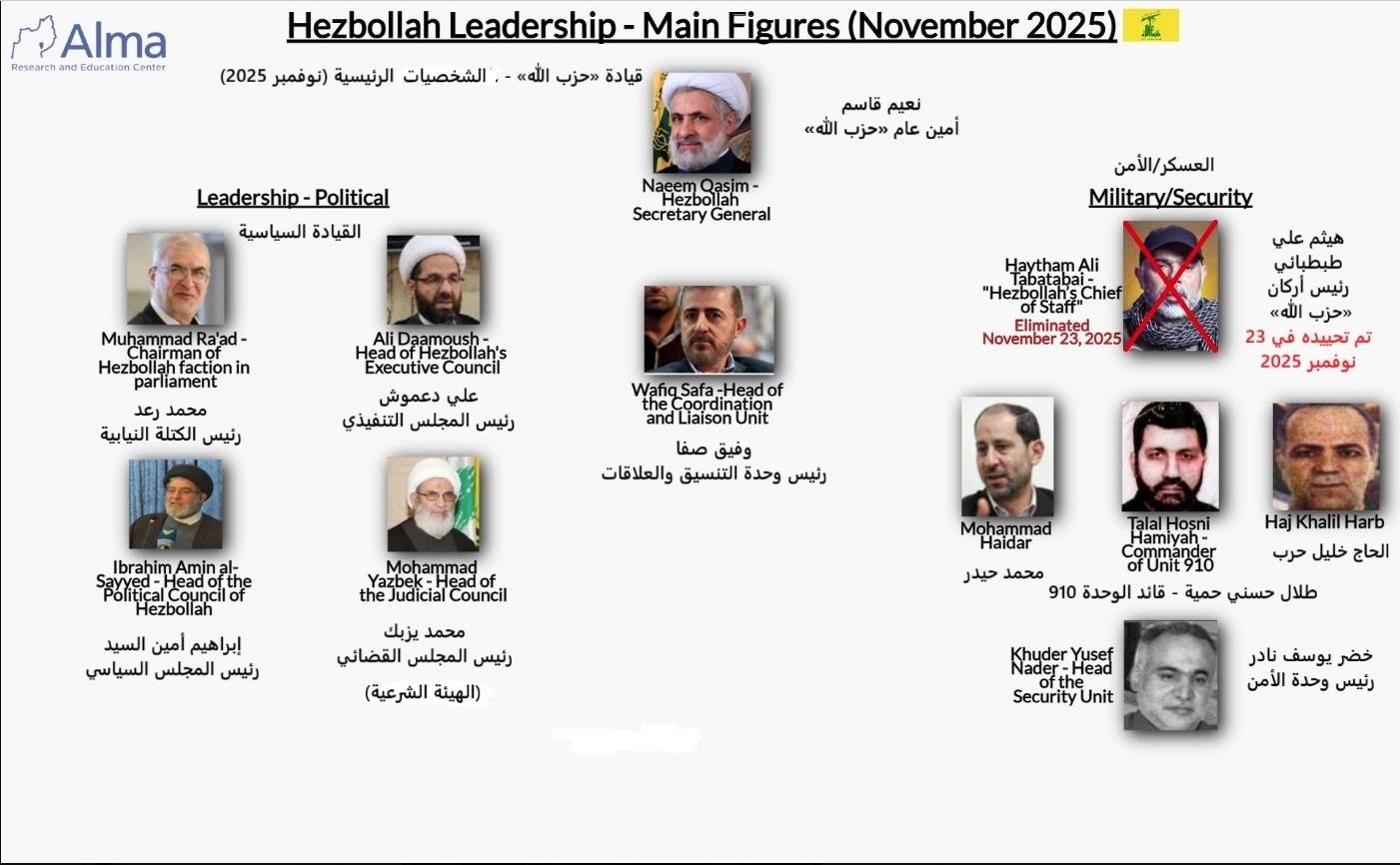 أعاد معهد “ألما” الإسرائيلي، المتخصّص برصد نشاطات “حزب الله” وتحليلها، نشر لائحة محدّثة تتضمّن أسماء عدد من قيادات الحزب السياسية والعسكرية، في خطوة أثارت تساؤلات عن دلالاتها وتوقيتها، وما إذا