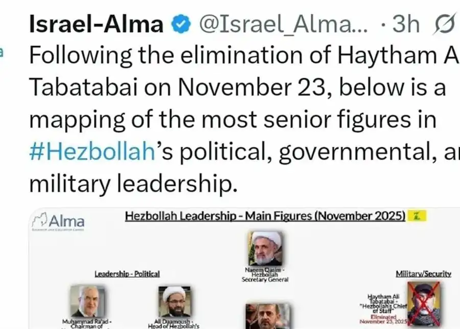 أعاد اغتيال هيثم علي الطبطبائي، القائد العسكري الأعلى في «حزب الله»، بعمق الضاحية الجنوبية، ترتيب المشهد الأمني داخل لبنان بصورة دراماتيكية. فبعد ساعات من العملية، نشر مركز «ألما» الإسرائيلي رسماً