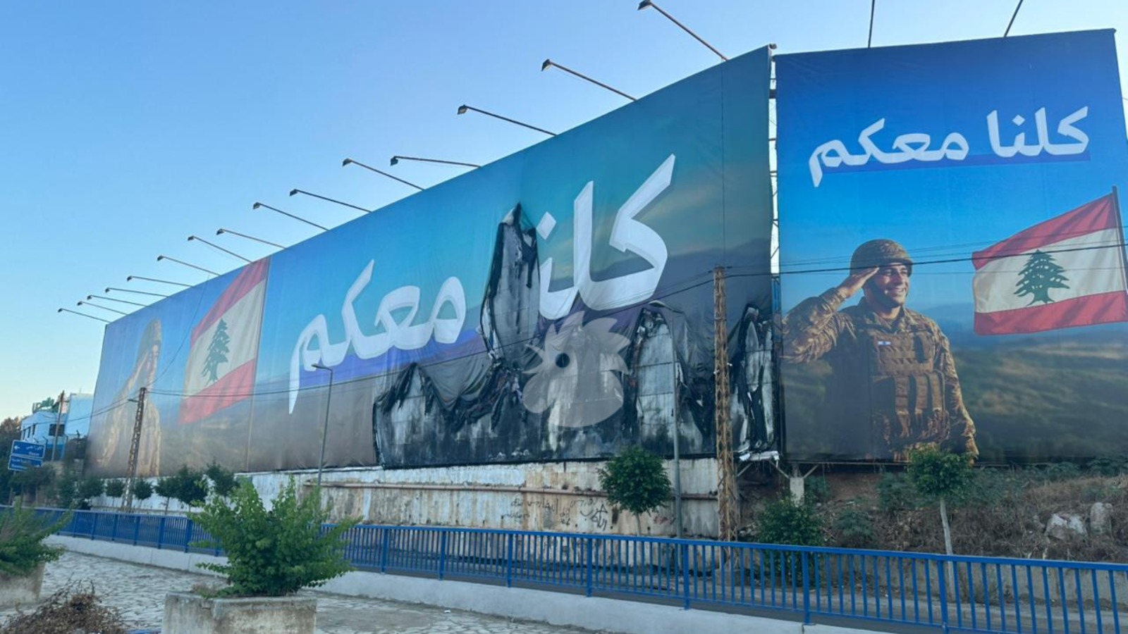 أحرق مجهولون يافطة “كلنا معكم” الداعمة للجيش اللبناني على طريق المطار. حرق يافطة ورُفعت هذه اليافطات على طريق المطار الشهر الماضي إثر قرار الحكومة اللبنانية بحصر السلاح بيد الدولة، وقبيل