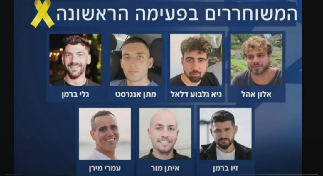 نشر الإعلام الإسرائيلي صورة الرهائن الـ 7 الذين تسلمهم الصليب الأحمر الدولي ضمن الدفعة الأولى. ,وافادت مصادر حركة حماس ان الدفعة الثانية من الأسرى الإسرائيليين ستسلّم بعد ساعة بالصّورة: الرهائن